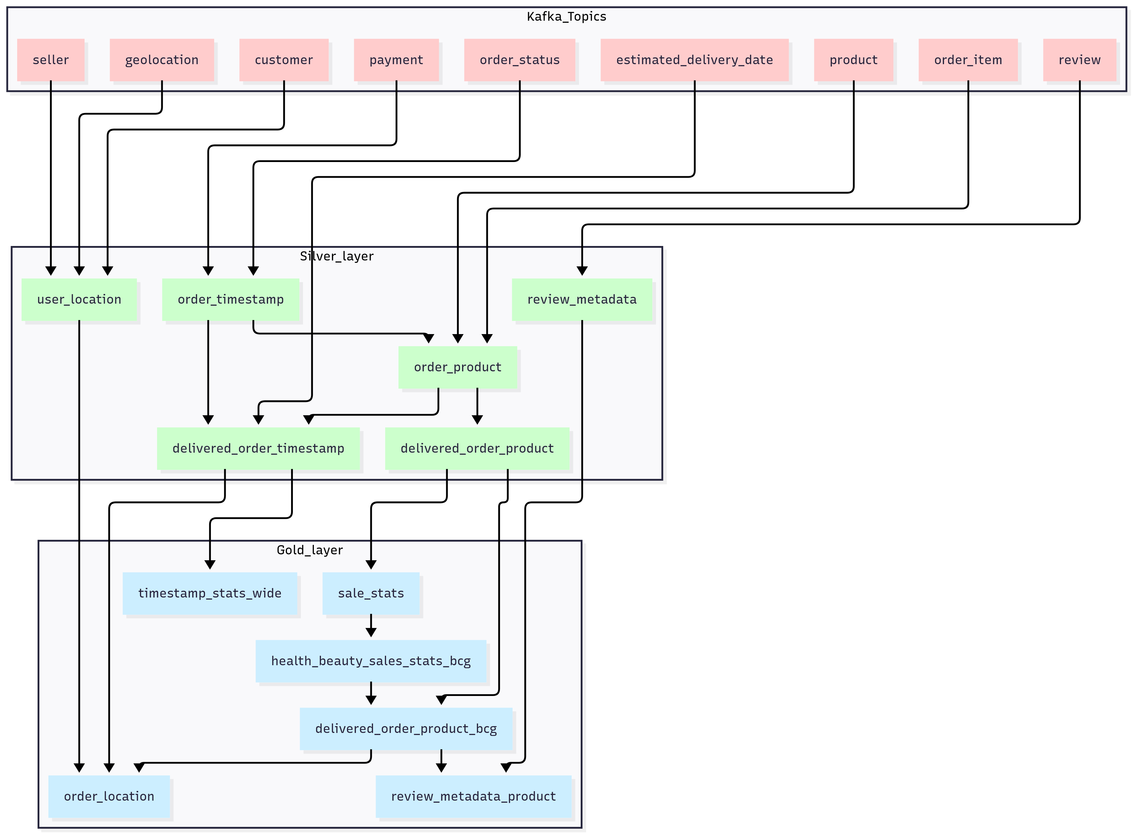 BCG Matrix 기반 Health & Beauty 제품군의 배송지연 모니터링이라는 목표로부터 아키텍처의 기본 요구사항을 아래와 같이 설정할 수 있었습니다.- 배송지연 모니터링을 위한 주문 상태 시간의 스트림 처리 필요